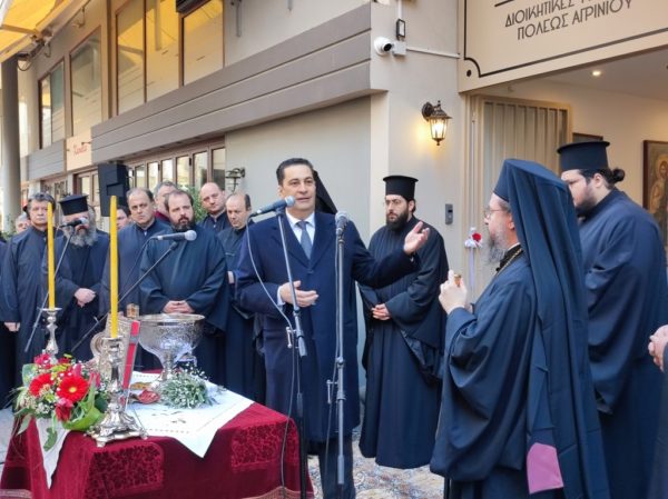 Ο Δήμαρχος Αγρινίου κατά τον δικό του χαιρετισμό ανέφερε, ότι μόνο χαρά και ευλογία μπορούν να νιώθουν σήμερα οι Αγρινιώτες, γιατί μέσα από την αναβάθμιση των Διοικητικών Υπηρεσιών της Ιεράς Μητρόπολης φανερώνεται η θέληση των Αγρινιωτών να έχουν κοντά τους τον Επίσκοπό τους. «Νιώθουμε αγάπη για το νέο μας Επίσκοπο, για έναν άνθρωπο που είχαμε την εικόνα, ότι είναι ένας σύγχρονος και δημιουργικός άνθρωπος. Τώρα το βλέπουμε από τον τρόπο που μας προσεγγίζετε, από τον τρόπο που όλο αυτό το χρονικό διάστημα επιτελείτε το έργο σας, με πολλή κούραση, γιατί πραγματικά καταφέρνετε να είστε παντού. Σας ευχαριστούμε, Σεβασμιώτατε και σας ευχόμαστε να είστε δημιουργικός και δυνατός και θα είμαστε πάντα δίπλα σας», ανέφερε χαρακτηριστικά ο κ. Δήμαρχος.
