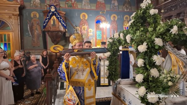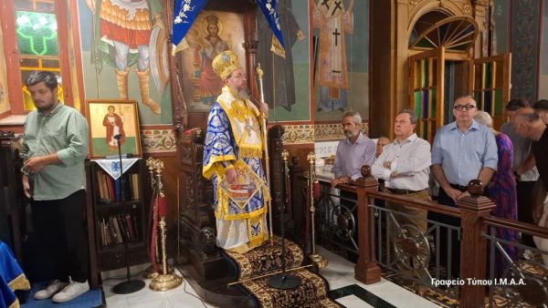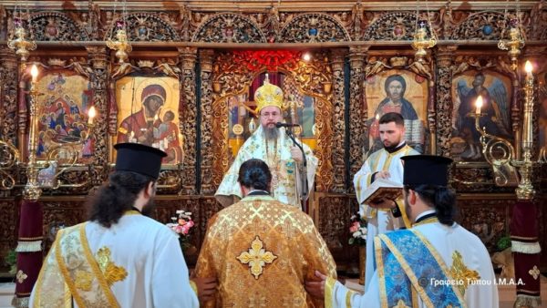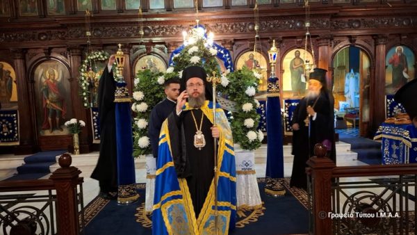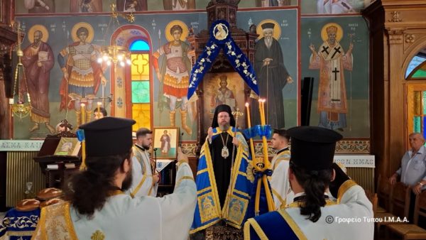 Χοροστάτησε στην ακολουθία του Όρθρου και προεξήρχε στην πανηγυρική Θεία Λειτουργία, κατά την απόλυση της οποίας απένειμε το οφφίκιο του Πρωτοπρεσβυτέρου στον Προϊστάμενο του Ναού, π. Θεόδωρο Ζήση.