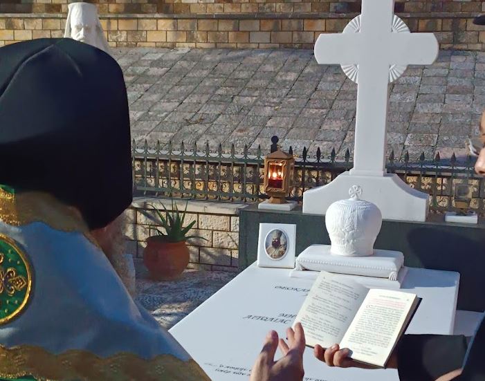 Κατά την άφιξή του τέλεσε τρισάγιο στους τάφους του Μακαριστού Μητροπολίτου Αιτωλίας και Ακαρνανίας Κυρού Θεοκλήτου και του μακαριστού Καθηγουμένου Αρχιμ. Ιεροθέου Σπανομήτσου, που βρίσκονται στον περίβολο της Μονής.