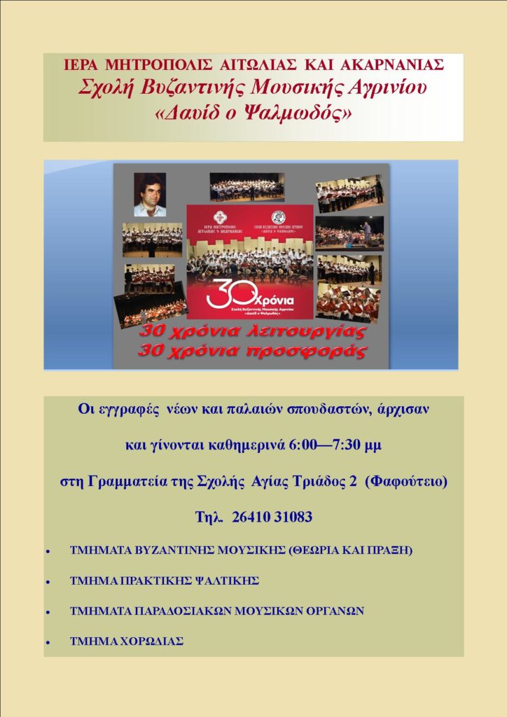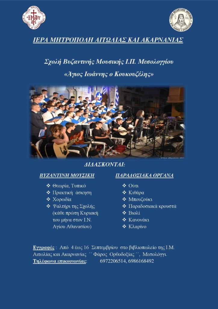 Από την Δευτέρα 4 Σεπτεμβρίου 2023 πραγματοποιούνται οι εγγραφές στις Σχολές Βυζαντινής Μουσικής της Ιεράς Μητρόπολης Αιτωλίας και Ακαρνανίας στο Μεσολόγγι και στο Αγρίνιο, οι οποίες θα διαρκέσουν μέχρι τέλος Σεπτεμβρίου.