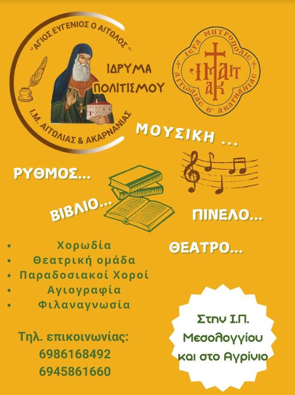 Εγγραφές στο Ίδρυμα Πολιτισμού «Άγιος Ευγένιος ο Αιτωλός» της Ι. Μ. Αιτωλίας και Ακαρνανίας