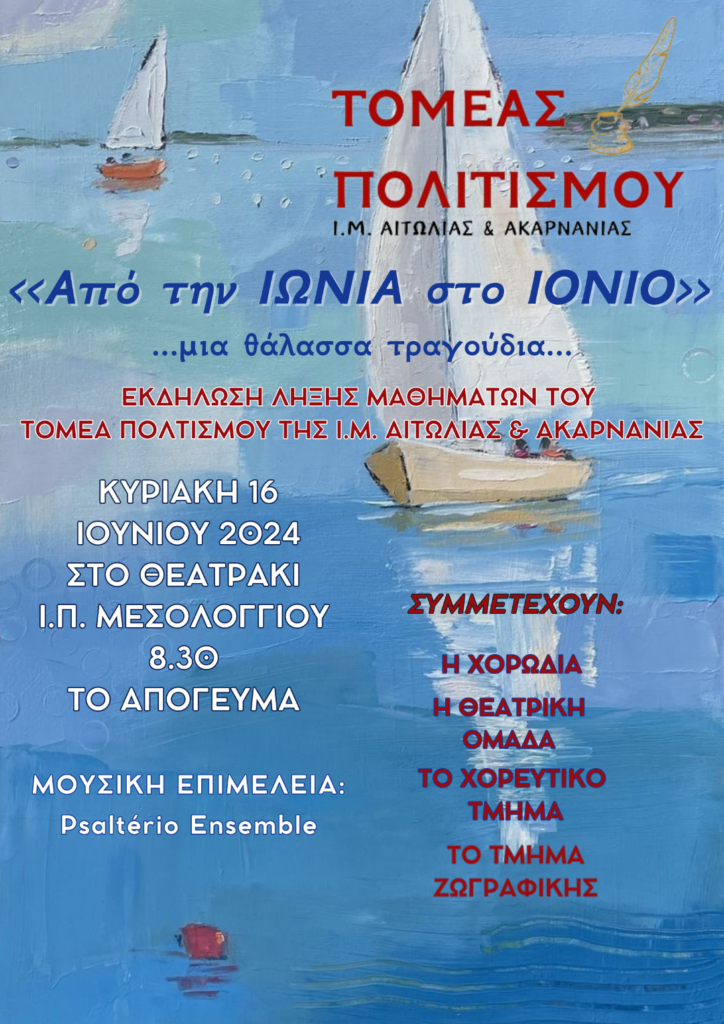 Με κεντρικό σύνθημα: «Από την Ιωνία στο Ιόνιο, μια θάλασσα τραγούδια» τα Μέλη του Τομέα Πολιτισμού θα παρουσιάσουν έκθεση ζωγραφικής, θεατρικά δρώμενα, παραδοσιακούς χορούς και τραγούδια πραγματοποιώντας ένα μουσικό ταξίδι στις θάλασσες των Ελλήνων.