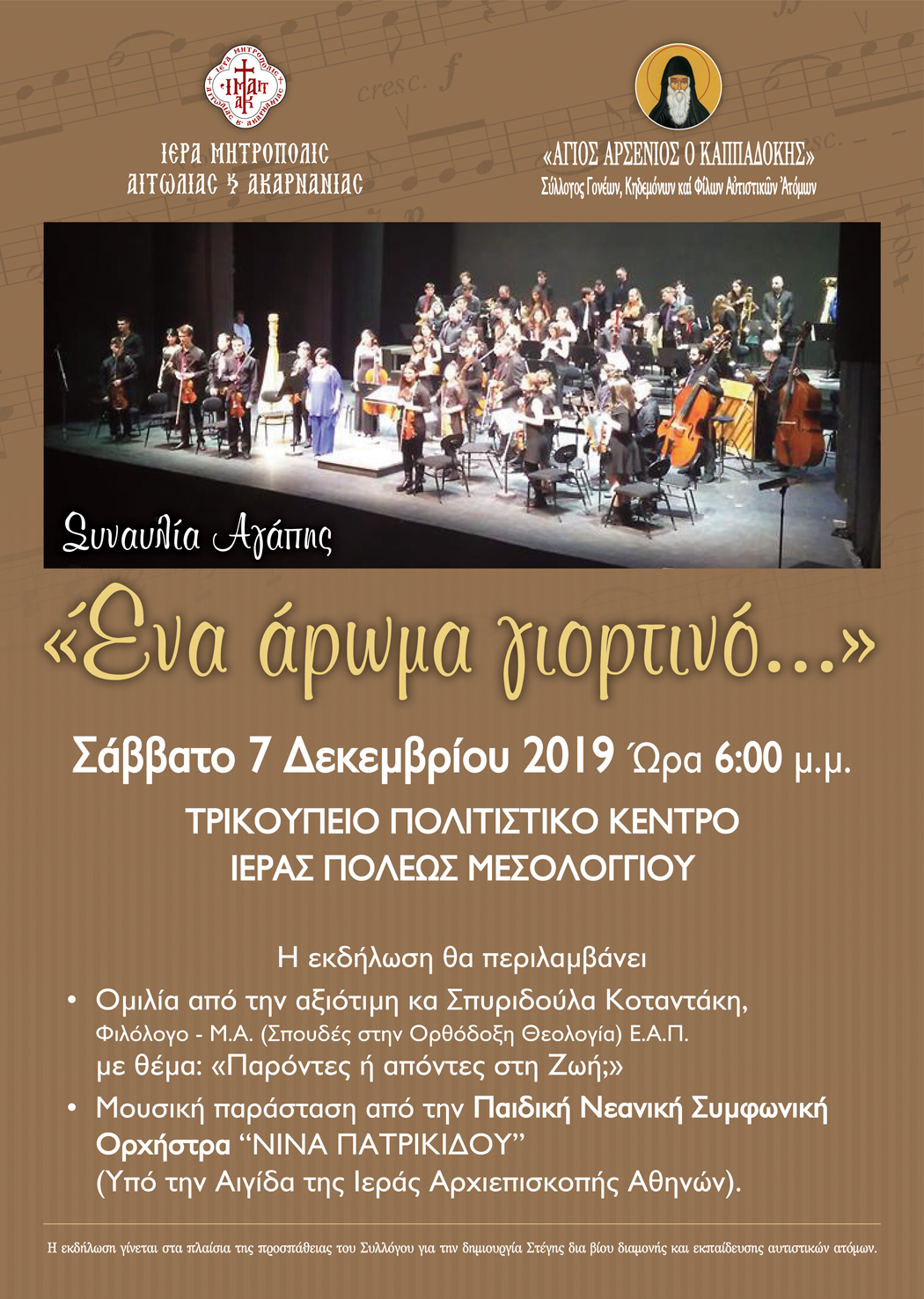 Η Ιερά Μητρόπολη Αιτωλίας και Ακαρνανίας και ο Σύλλογος Γονέων, Κηδεμόνων και Φίλων Αυτιστικών Ατόμων «ΑΓΙΟΣ ΑΡΣΕΝΙΟΣ Ο ΚΑΠΠΑΔΟΚΗΣ» σας προσκαλούν στην Μουσική Συναυλία Αγάπης  “Ένα άρωμα γιορτινό…” το Σάββατο 7 Δεκεμβρίου 2019, ώρα 6.00 μ.μ. στο Τρικούπιο Πολιτιστικό Κέντρο Ι.Π.Μεσολογγίου.