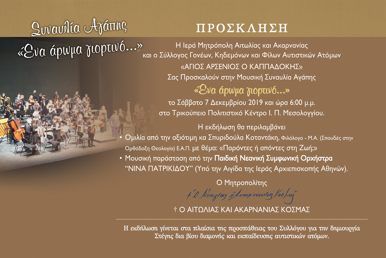 Η Ιερά Μητρόπολη Αιτωλίας και Ακαρνανίας και ο Σύλλογος Γονέων, Κηδεμόνων και Φίλων Αυτιστικών Ατόμων «ΑΓΙΟΣ ΑΡΣΕΝΙΟΣ Ο ΚΑΠΠΑΔΟΚΗΣ» σας προσκαλούν στην Μουσική Συναυλία Αγάπης  “Ένα άρωμα γιορτινό…” το Σάββατο 7 Δεκεμβρίου 2019, ώρα 6.00 μ.μ. στο Τρικούπιο Πολιτιστικό Κέντρο Ι.Π.Μεσολογγίου.