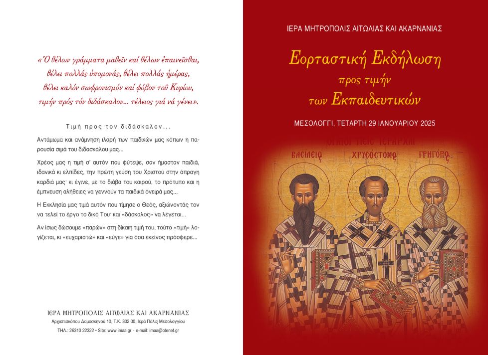 Η Ιερά Μητρόπολη προσκαλεί όλους να συμμετάσχουν στις εκδηλώσεις αυτές για να τιμήσουμε στα πρόσωπα των παλαιμάχων Εκπαιδευτικών, το σύνολο της εκπαιδευτικής κοινότητας, των δασκάλων και των καθηγητών που κοπιάζουν καθημερινά για τη μόρφωση και την διαπαιδαγώγηση των παιδιών μας.
