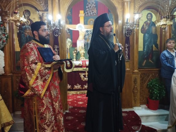 Στη συνέχεια ο Προϊστάμενος του Ιερού Ναού, Πρωτοπρ. Κωνσταντίνος Μπρέσιακας καλωσόρισε με θερμούς λόγους, εκ μέρους όλων των κατοίκων, τον Άγιο Ταλαντίου στην Ενορία της γενέτειράς του και του προσέφερε μία ποιμαντορική ράβδο.