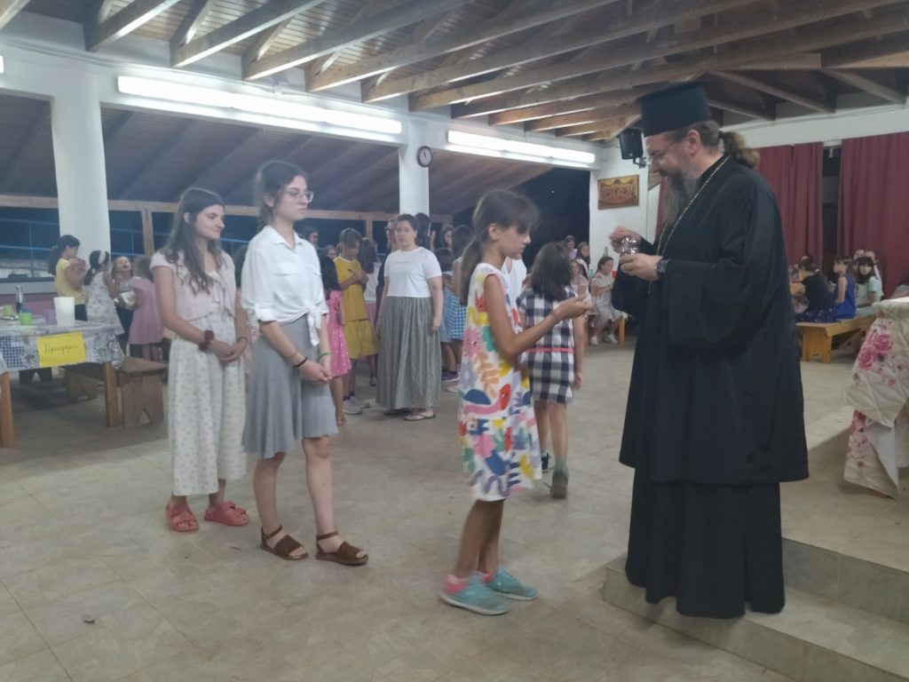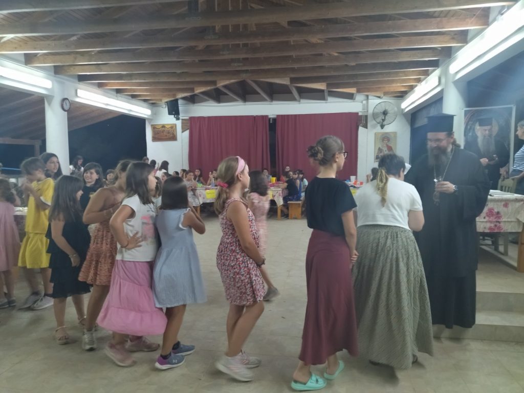 Στην συνέχεια ευλόγησε το δείπνο και μοίρασε σε όλες σταυρουδάκια και ευλογίες που έφερε από τα Ιεροσόλυμα και ευχήθηκε να περάσουν μια καλή, όμορφη και εποικοδομητική κατασκηνωτική περίοδο.