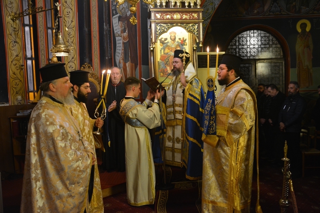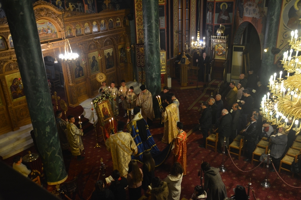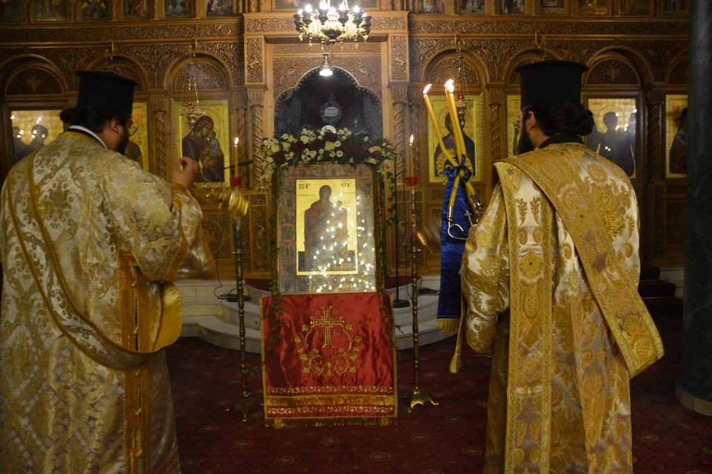 Στην ακολουθία χοροστάτησε ο Μητροπολίτης Αιτωλίας και Ακαρνανίας κ. Δαμασκηνός, ο οποίος έψαλλε τους Οίκους ενώπιον της εικόνας της Θεοτόκου, συμπαραστατούμενος από τον πρωτοπρ. Δημήτριο Πατσιαλό, Προϊστάμενο του Ναού και τους διακόνους π. Στέφανο Καππέ και π. Αμβρόσιο Καλλιάφα. Τους ύμνους της Ακολουθίας απέδωσαν ο Πρωτοψάλτης κ. Κωνσταντίνος Μπορμπότσιαλος και ο Λαμπαδάριος κ. Κωνσταντίνος Καντάνης.