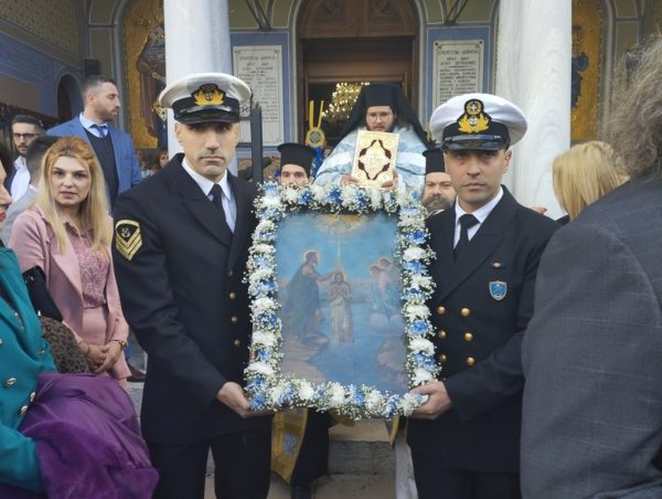 Αμέσως μετά τη Θεία Λειτουργία ο Σεβασμιώτατος τέλεσε την Ακολουθία του Μεγάλου Αγιασμού εντός του Ναού και στη συνέχεια, με λιτανευτική πομπή, άπαντες κατευθύνθηκαν στο Λιμάνι της Ιεράς Πόλεως, όπου πραγματοποιήθηκε η Τελετή Κατάδυσης του Τιμίου Σταυρού και ο Αγιασμός των Υδάτων.