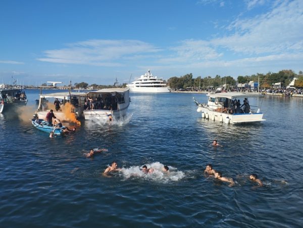Αμέσως μετά τη Θεία Λειτουργία ο Σεβασμιώτατος τέλεσε την Ακολουθία του Μεγάλου Αγιασμού εντός του Ναού και στη συνέχεια, με λιτανευτική πομπή, άπαντες κατευθύνθηκαν στο Λιμάνι της Ιεράς Πόλεως, όπου πραγματοποιήθηκε η Τελετή Κατάδυσης του Τιμίου Σταυρού και ο Αγιασμός των Υδάτων.