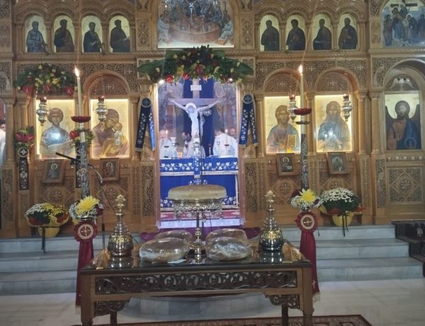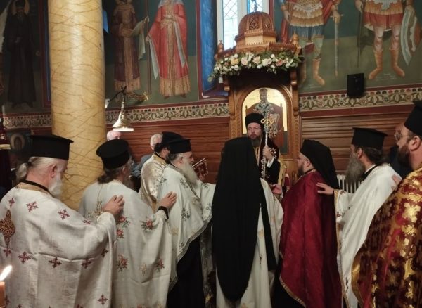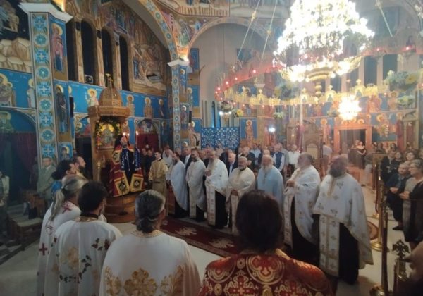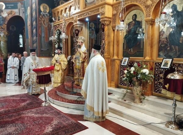 Πριν την απόλυση του Εσπερινού απένειμε το οφφίκιο του Πρωτοπρεσβυτέρου στον π. Κωνσταντίνο Γιολδάση και προσέφερε τιμητική πλακέτα εκ μέρους της Ενορίας στον κ. Θωμά Παπασάββα, ο οποίος διετέλεσε πολλά χρόνια ιεροψάλτης του Ιερού Ναού.