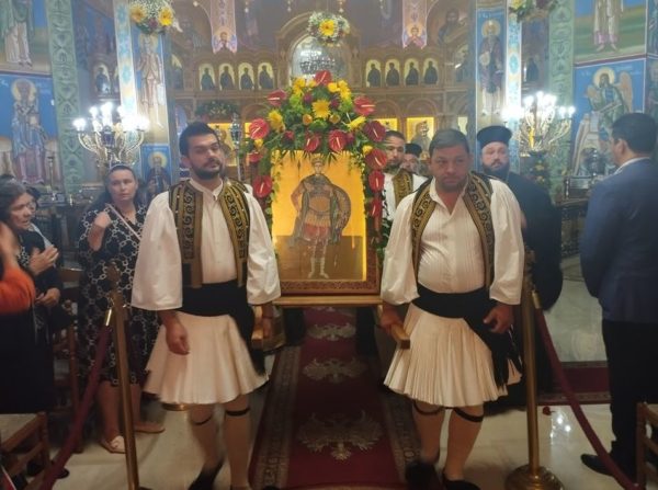 Πριν την απόλυση του Εσπερινού, ο Σεβασμιώτατος απένειμε το οφφίκιο του Πρωτοπρεσβυτέρου στον π. Κωνσταντίνο Λαζαρίνη και στην συνέχεια ακολούθησε η λιτάνευση της Ιεράς Εικόνος του Αγίου στους δρόμους της Παραβόλας.