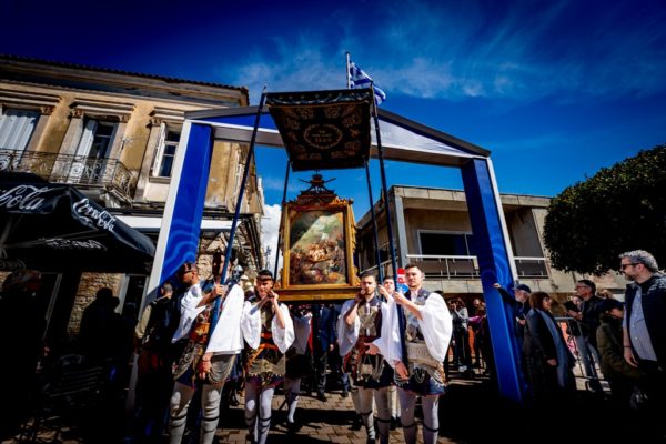 Στη συνέχεια, με λιτανευτική πομπή, μεταφέρθηκαν η Εικόνα της Εξόδου, το Ιερό Λάβαρο, ο Σταυρός Ευλογίας του Επισκόπου Ρωγών και Κοζύλης Ιωσήφ και το καριοφίλι του Στρατηγού Δημητρίου Μακρή, από το Μουσείο Ιστορίας και Τέχνης – Πινακοθήκη, στον Ιερό Μητροπολιτικό Ναό του Αγίου Σπυρίδωνος.