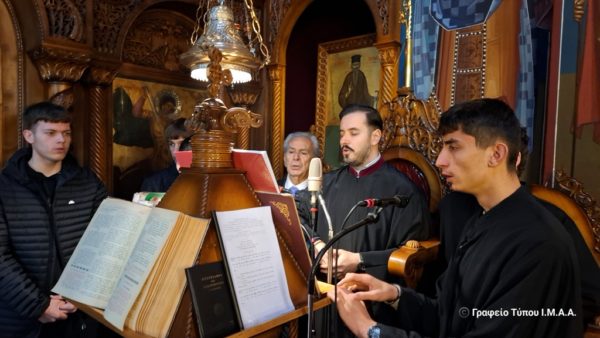 Στο δεξιό Αναλόγιο έψαλλε χορός ιεροψαλτών, υπό την διεύθυνση του Πρωτοψάλτου του Ναού κ. Χρήστου Ζήση και στο αριστερό αναλόγιο έψαλλαν στελέχη των κατασκηνώσεων, υπό την διεύθυνση του κ. Αλεξίου Κονδύλη.