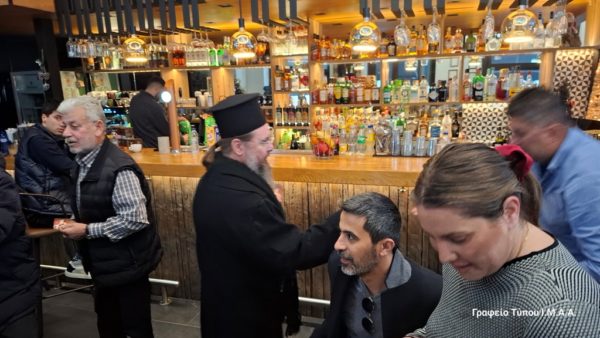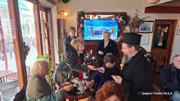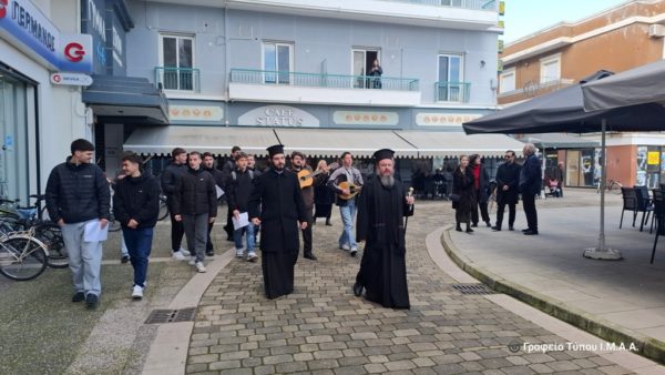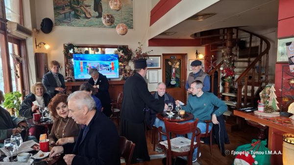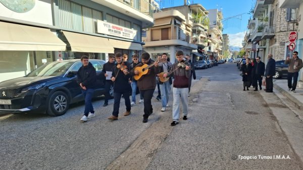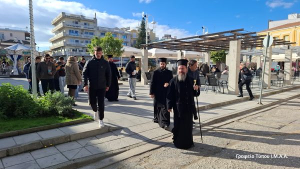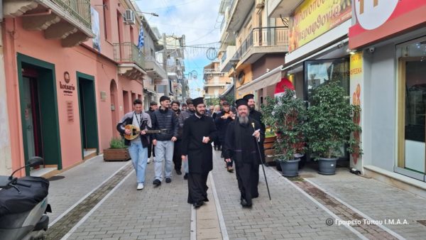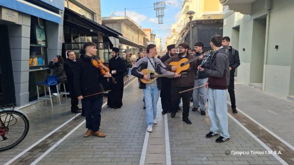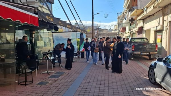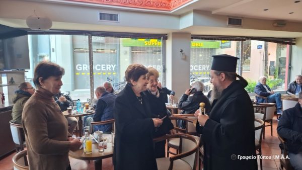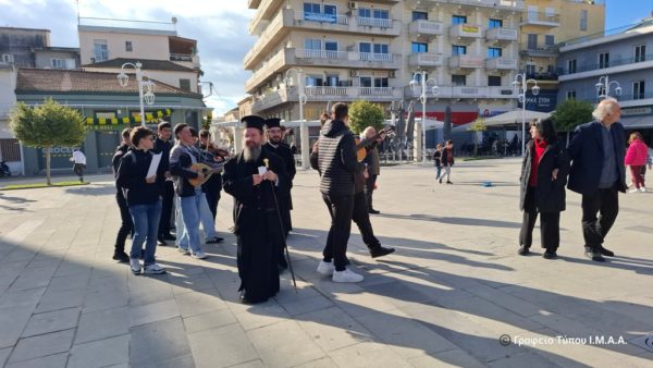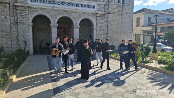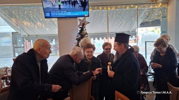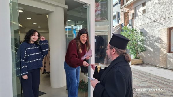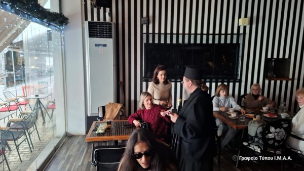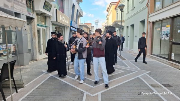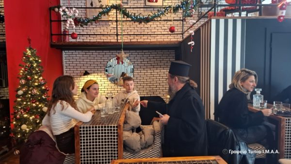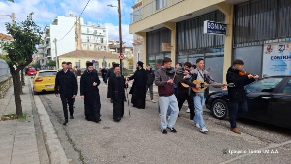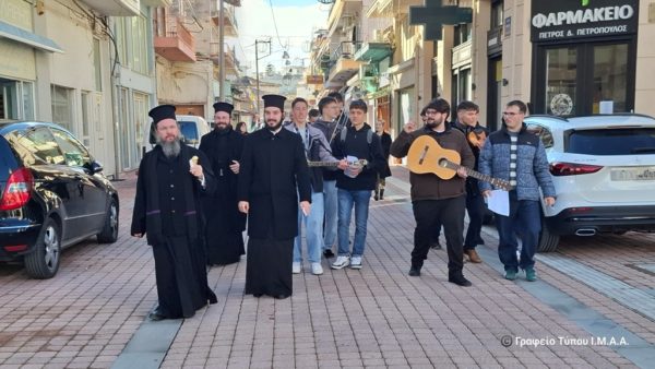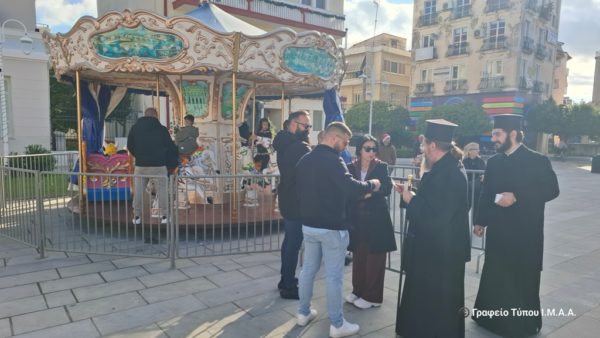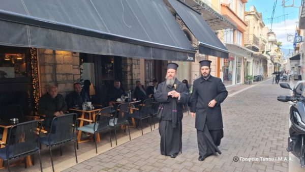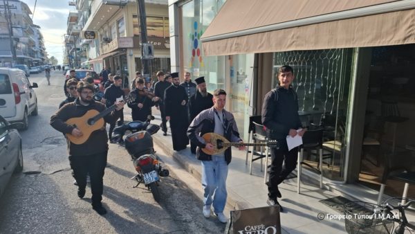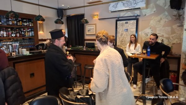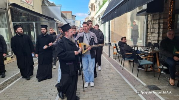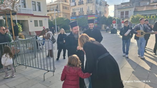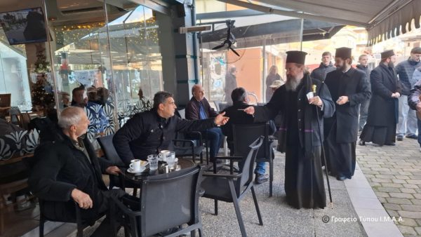 Ο Σεβασμιώτατος ευχήθηκε χρόνια πολλά στους ιδιοκτήτες των καταστημάτων, τους κατοίκους και τους επισκέπτες της Ιεράς Πόλεως, συνομίλησε μαζί τους και διένειμε σε όλους ως ευλογία την εικόνα της Γεννήσεως του Χριστού, ενώ οι νέοι τραγουδούσαν Χριστουγεννιάτικα τραγούδια και έψαλλαν κάλαντα, με τη συνοδεία παραδοσιακών μουσικών οργάνων.