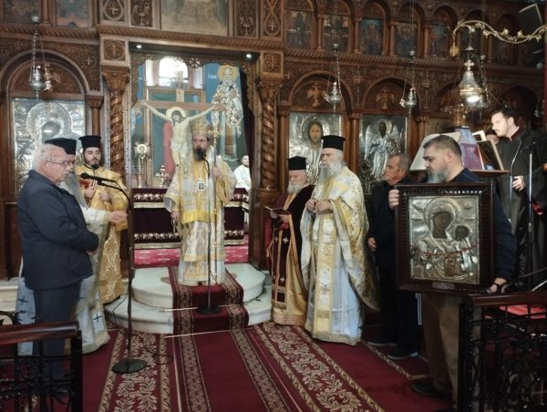 Κατά την Απόλυση της Θείας Λειτουργίας, σε συγκινητική ατμόσφαιρα, πραγματοποιήθηκε η δωρεά Ιεράς Εικόνας της Υπεραγίας Θεοτόκου, την οποία κατείχε ως πολύτιμο κειμήλιο η οικογένεια Λαζοπούλου και διασώθηκε με θαυμαστό τρόπο κατά την Έξοδο του Μεσολογγίου. Η Ιερά Εικόνα παραδόθηκε στον Ιερό Ναό Αγίου Παντελεήμονος, όπου θα φυλάσσεται πλέον ως ατίμητος θησαυρός μετά την συντήρησή της. Ο Σεβασμιώτατος ευχαρίστησε την οικογένεια για την προσφορά της Ιεράς Εικόνος και προέτρεψε τον π. Αναστάσιο να καθιερώσει την ετήσια πανήγυρη του θεομητορικού αυτού Εικονίσματος, στην οποία θα προεξάρχει ο ίδιος.