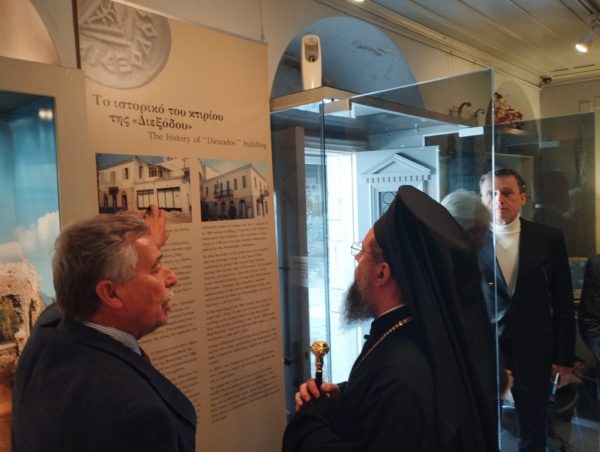 Ο κ. Κορδόσης υποδέχθηκε θερμά τον Μητροπολίτη κ. Δαμασκηνό, παρουσία φίλων του Κέντρου και τον ξενάγησε στους χώρους της «Διεξόδου», όπου εκτίθενται κειμήλια της Επανάστασης του ’21, αρχαία ευρήματα από την περιοχή, βυζαντινές εικόνες και εκκλησιαστικά είδη, φιλελληνικά αντικείμενα, τεκμήρια της Νεότερης Ιστορίας του Μεσολογγίου, αλλά και εκατοντάδες εικαστικά έργα τέχνης ανθρωποκεντρικού χαρακτήρα χρονολογούμενα από το 1875 μέχρι σήμερα.