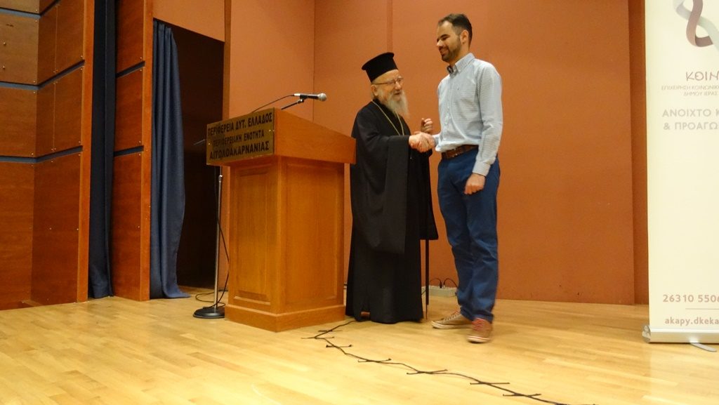 Στη συνάντηση που πραγματοποιήθηκε στην Ιερά Πόλη Μεσολογγίου, στην αίθουσα εκδηλώσεων της Περιφερειακής Ενότητας Αιτωλ/νίας, παραβρέθηκε και μίλησε στα παιδιά των σχολείων και ο Σεβασμιώτατος Μητροπολίτης Αιτωλίας και Ακαρνανίας κ. Κοσμάς.