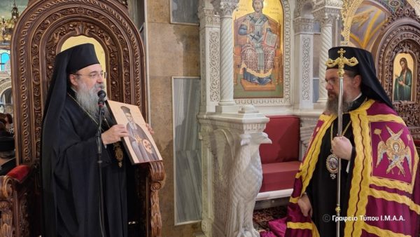 Ο Μητροπολίτης Πατρών ευχήθηκε στον Μητροπολίτη Αιτωλίας και Ακαρνανίας έτη πολλά και αναστάσιμα και του προσέφερε μια εικόνα του Αγίου Γερβασίου, του Διδασκάλου των Πατρών.