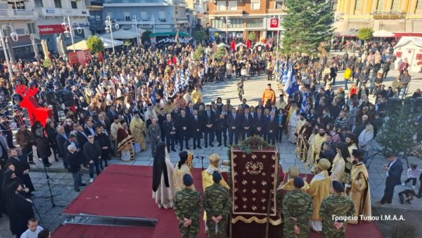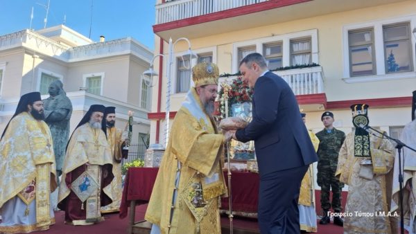 Κατά την προσφώνησή του ο Μητροπολίτης Αιτωλίας και Ακαρνανίας ευχαρίστησε με θερμούς λόγους τους Αγίους Αρχιερείς που λάμπρυναν με την παρουσία τους την ιερά πανήγυρη του πολιούχου και προστάτου της Ιεράς Πόλεως του Μεσολογγίου. Συνεχάρη το στρατιωτικό άγημα, τα μέλη των φιλαρμονικών, τα μέλη των πολιτιστικών συλλόγων, τους μαθητές και τις μαθήτριες, όλον τον ευλογημένο λαό, διότι με την συμμετοχή τους και την παρουσία τους «προσφέρουν τον σεβασμό, την τιμή και την αγάπη τους στον Άγιο, στον οποίο καταφεύγουν προσευχητικά για να εκζητήσουν τις μεσιτείες και τις πρεσβείες του. Είναι ένας ευλογημένος λαός, που αγαπά την ιστορία, σέβεται την πατρίδα, τιμά την πίστη του και αγωνίζεται για την προκοπή του. Είναι ένας λαός που μέσα στην καρδιά του πάλλονται δύο αξίες, ο Χριστός και η Ελλάδα, η αγάπη για την ιστορία και η προσήλωση στις αρχές της πίστεως. Αυτός ο λαός, σήμερα, ενώνει την προσευχή του, η οποία απευθύνεται στον Θρόνο της μεγαλωσύνης του Θεού και Τον παρακαλεί να περικρατεί τα ένδοξα γηρατειά της Ιεράς Πόλεως, να καθοδηγεί τα ελπιδοφόρα νιάτα, να προστατεύει τις οικογένειες, να στηρίζει τους επαγγελματίες και τους βιοπαλαιστές που δίνουν καθημερινά τη μάχη για τον επιούσιο άρτο. Ολόκληρη η Ιερά Πόλη σήμερα, ιερός κλήρος, άρχοντες και λαός συνεορτάζουμε τον δικό μας Προστάτη και Έφορο. Σας ευχαριστούμε άγιοι Αρχιερείς για την ευλογητή παρουσία σας. Υψώστε, παρακαλώ, τα αρχιερατικά σας χέρια και ευλογήστε την Ιερά Πόλη μας και τον φιλόχριστο και φιλάγιο λαό της. Χρόνια πολλά και ευλογημένα, αδελφοί, σε όλους».