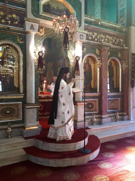 Τον Σεβασμιώτατο στην Αρχιερατική Θεία Λειτουργία πλαισίωσαν ο προϊστάμενος του Ιερού Ναού Αγίας Τριάδας Αγρινίου Αρχιμ. π.Νεκτάριος Τριάντης, ο Ιεροκήρυκας της Μητροπόλεώς μας Αρχιμ. π.Μακάριος Αντωνόπουλος, ο Αρχιερατικός επίτροπος Βονίτσης Πρωτοπρεσβύτερος π.Χρήστος Βέττας και ο προϊστάμενος του Ιερού Ναού μας Πρωτοπρεσβύτερος π.Κωνσταντίνος Γατσούλης.