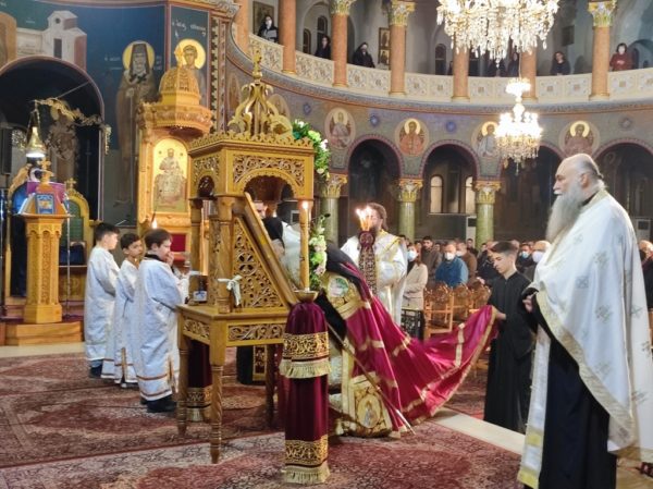 Ο Σεβασμιώτατος έψαλλε τους οίκους ενώπιον της εικόνας της Θεοτόκου και κήρυξε τον θείο λόγο στους πιστούς ερμηνεύοντας τον στίχο από την ζ’ ωδή του κανόνος: «Ἰατῆρα τῶν ἀνθρώπων ἡ κυήσασα, χαῖρε, Θεόνυμφε».