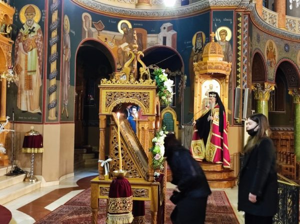 Ο Σεβασμιώτατος έψαλλε τους οίκους ενώπιον της εικόνας της Θεοτόκου και κήρυξε τον θείο λόγο στους πιστούς ερμηνεύοντας τον στίχο από την ζ’ ωδή του κανόνος: «Ἰατῆρα τῶν ἀνθρώπων ἡ κυήσασα, χαῖρε, Θεόνυμφε».