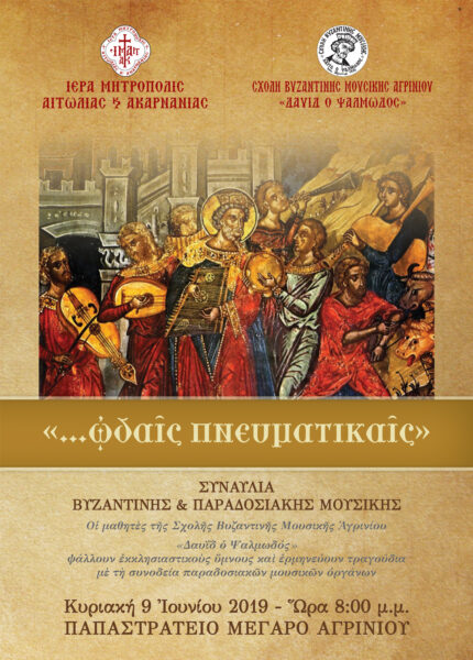 Στο Αγρίνιο, η Σχολή Βυζαντινής Μουσικής «Δαυΐδ ο Ψαλμωδός» θα πραγματοποιήσει την εκδήλωσή της στην αίθουσα εκδηλώσεων του Παπαστρατείου Μεγάρου της Γυμναστικής Εταιρείας, την Κυριακή 9 Ιουνίου και ώρα 8:00’ μ.μ.