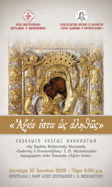 Στην Ιερά Πόλη Μεσολογγίου, η αντίστοιχη εκδήλωση της Σχολής Βυζαντινής Μουσικής «Άγιος Ιωάννης ο Κουκουζέλης» θα λάβει χώρα στα προπύλαια του Ιερού Μητροπολιτικού Ναού Αγίου Σπυρίδωνος, την Δευτέρα 10 Ιουνίου και ώρα 8:00’ μ.μ. Η εκδήλωση θα είναι αφιερωμένη στο πρόσωπο της Παναγίας μας.