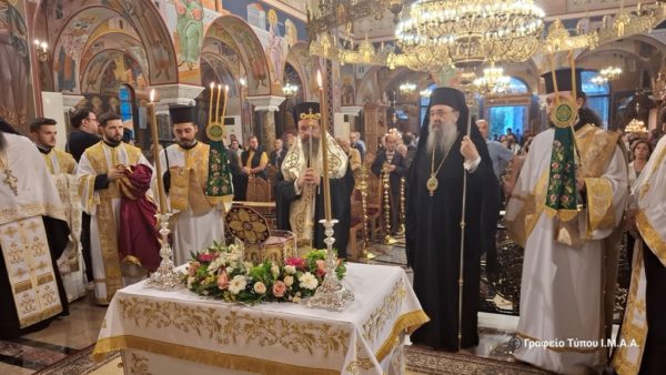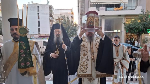 Αρχικά, στα προπύλαια του Μητροπολιτικού Ναού, ο Σεβασμιώτατος Μητροπολίτης Αιτωλίας και Ακαρνανίας κ. Δαμασκηνός, επικεφαλής του ιερού κλήρου, των εκπροσώπων των τοπικών αρχών και του φιλαγίου λαού, υποδέχθηκε την Τιμία και Χαριτόβρυτο Κάρα του Οσίου και Θεοφόρου Πατρός ημών Γερβασίου, την οποία εκόμισε ο Σεβασμιώτατος Μητροπολίτης Πατρών κ. Χρυσόστομος προς ευλογία και επιστηριγμό των πιστών.