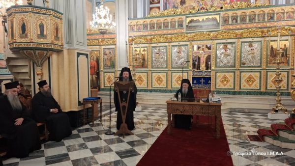 Προσφωνώντας ο Σεβασμιώτατος Μητροπολίτης κ. Δαμασκηνός, τον Μητροπολίτη Ναυπάκτου και Αγίου Βλασίου κ. Ιερόθεο τον καλωσόρισε με θερμούς λόγους στην Ιερά Μητρόπολη Αιτωλίας και Ακαρνανίας και στην Ιερά Πόλη του Μεσολογγίου, που εορτάζει την συμπλήρωση 200 ετών από την ηρωική Έξοδο της Φρουράς των Ελευθέρων Πολιορκημένων και τον ευχαρίστησε, γιατί ανταποκρίθηκε στην πρόκληση της τοπικής μας Εκκλησίας, να μιλήσει στην Επετειακή Ιερατική Σύναξη.