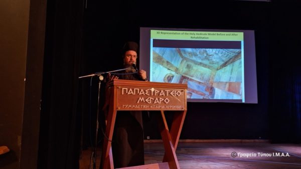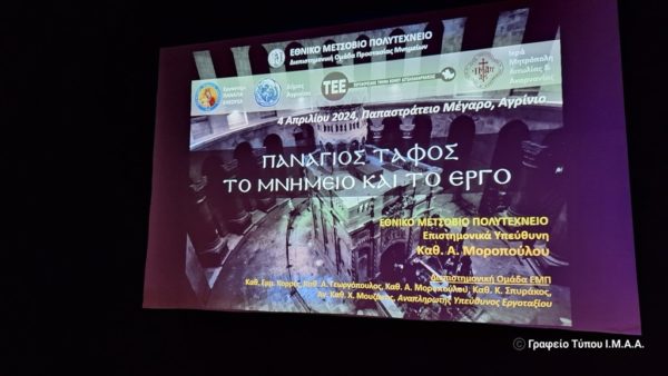 Εκδήλωση, με τίτλο: «Πανάγιος Τάφος – Το Μνημείο και το Έργο», που τελούσε υπό την αιγίδα της Ιεράς Μητροπόλεως Αιτωλίας και Ακαρνανίας, διοργάνωσε το Εργαστήρι ΠΑΝΑΓΙΑ ΕΛΕΟΥΣΑ, σε συνεργασία με τον Δήμο Αγρινίου και το ΤΕΕ Αιτωλοακαρνανίας στην αίθουσα του Παπαστρατείου Μεγάρου Αγρινίου, την Πέμπτη 4 Απριλίου, με ομιλήτρια την Καθηγήτρια, κ. Αντωνία Μοροπούλου, η οποία ήταν επικεφαλής της Διεπιστημονικής Ομάδας του Εθνικού Μετσοβείου Πολυτεχνείου που πραγματοποίησε την αποκατάσταση του Ιερού Κουβουκλίου του Παναγίου Τάφου