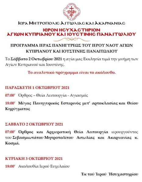 Την μνήμη των Αγίων Κυπριανού και Ιουστίνης θα εορτάσει το φερώνυμο Ιερό Ησυχαστήριο στο Παναιτώλιο, Αιτωλοακαρνανίας, όπου ανήμερα της πανηγύρεως Σάββατο 2 Οκτωβρίου, θα τελεσθεί Αρχιερατική Θεία Λειτουργία, ιερουργούντος του Σεβασμιωτάτου Μητροπολίτου Αιτωλίας και Ακρνανίας κ. Κοσμά.