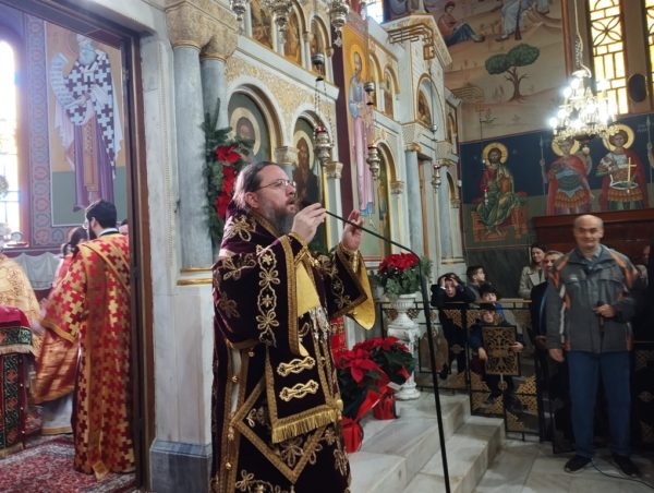 Τον θείο λόγο κήρυξε ο Πρωτοσύγκελλος της Ιεράς Μητροπόλεως, Αρχιμ. Θεόκλητος Ράπτης, ο οποίος μίλησε με θέμα: «Δεῦτε ἴδωμεν, πιστοί, ποῦ ἐγεννήθη ὁ Χριστός». Ο π. Θεόκλητος χρησιμοποιώντας λόγους Πατέρων και Αγίων της Εκκλησίας μας και κυρίως του Ιερού Χρυσοστόμου, επεσήμανε, ότι ένας άνθρωπος έχει αληθινά τον Χριστό, όταν κατοικεί μέσα στην καρδιά του, διότι ο Χριστός είναι η Αγάπη και ο θρόνος της αγάπης είναι η καρδιά. Όταν ο Θεός κατοικεί εκεί, τότε η καρδιά πληρούται από την αλήθεια και πλημμυρίζει τον άνθρωπο άρρητη γλυκύτητα.