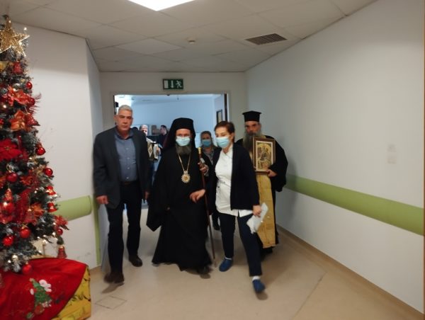 Ο Σεβασμιώτατος επισκέφθηκε τους θαλάμους νοσηλείας και τους διαδρόμους και αντάλλαξε εορταστικές ευχές με τους ασθενείς, τους συνοδούς, το ιατρικό και το νοσηλευτικό προσωπικό, ενώ οι νέοι τραγουδούσαν κάλαντα και χριστουγεννιάτικα τραγούδια, συνοδεία παραδοσιακών οργάνων.