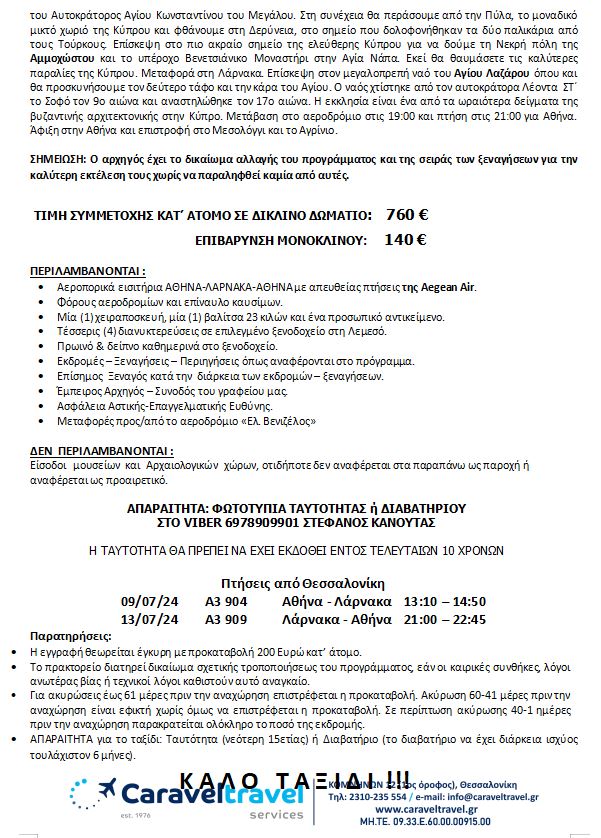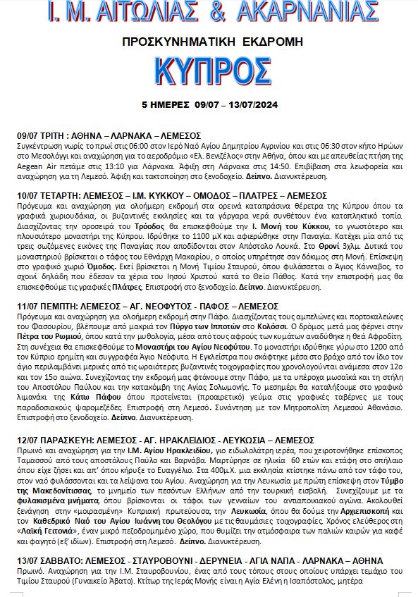 Η Ιερά Μητρόπολη Αιτωλίας και Ακαρνανίας διοργανώνει πενθήμερη Προσκυνηματική εκδρομή στο μαρτυρικό νησί της Κύπρου, από την Τρίτη 9 Ιουλίου έως και την Παρασκευή 13 Ιουλίου 2024.
