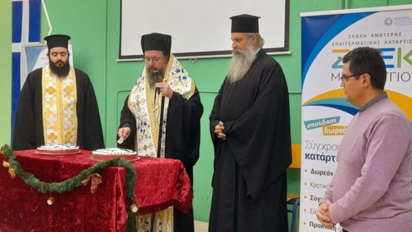 Στη συνέχεια μετέβη στη Σχολή Ανώτερης Επαγγελματικής Κατάρτισης Μεσολογγίου, όπου ευχήθηκε στον Διευθυντή, τους Διδάσκοντες και τους Εκπαιδευόμενους για τη νέα χρονιά και ευλόγησε την πρωτοχρονιάτικη βασιλόπιτα της Σχολής.
