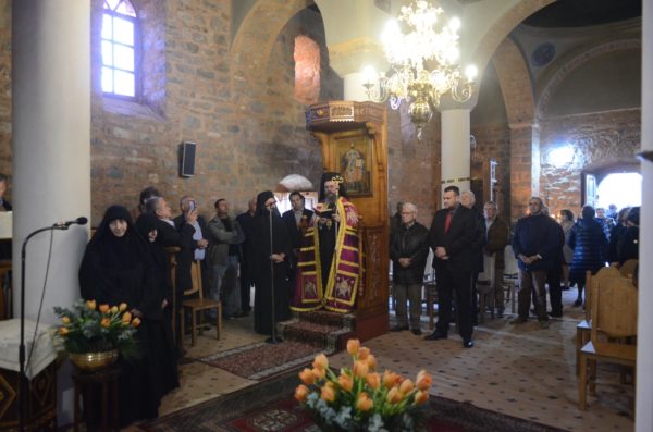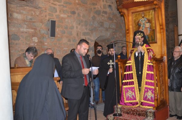 Κατά την προσφώνησή της η Ηγουμένη Γερόντισσα Άννα αναφέρθηκε στην ίδρυση και στην ιστορία της Μονής και στην αγάπη που έτρεφαν για το Μοναστήρι οι τρεις τελευταίοι Μητροπολίτες Αιτωλίας και Ακαρνανίας. Ο μακαριστός Ιερόθεος ο Β’ μάλιστα επέλεξε να ταφεί σε αυτή. Σε ανάμνηση της πρώτης επισκέψεως προσέφερε στον Σεβασμιώτατο το βιβλίο του Αθανασίου Παλιούρα «Βυζαντινή Αιτωλοακαρνανία» και μια γκραβούρα του 1850 που απεικονίζει έναν χάρτη της κεντρικής Ελλάδος.