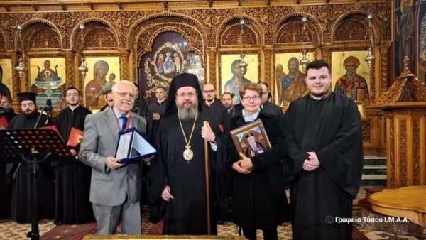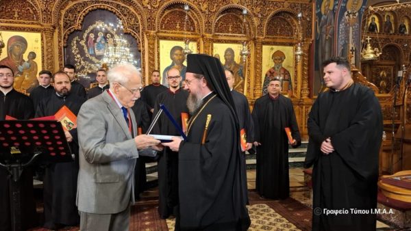 Ακολούθησε η επίδοση τιμητικής πλακέτας στον Άρχοντα Πρωτοψάλτη από τον Σεβασμιώτατο Ποιμενάρχη μας κ. Δαμασκηνό, για την όλη προσφορά του στην εκκλησιαστική μουσική και γενικότερα μέσα στην Εκκλησία, μιας και αποτελεί ένας από τους γνήσιους εκφραστές της ψαλτικής παράδοσης.