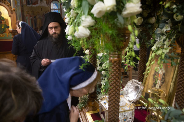 Πιστοί κάθε ηλικίας προσέρχονται ευλαβικά στον Ιερό Μητροπολιτικό Ναό Ζωοδόχου Πηγής Αγρινίου για να λάβουν την ευλογία και να προσκυνήσουν το πανίερο κειμήλιο που κόμισε ο Πανοσιολογιώτατος Καθηγούμενος της Ιεράς Μεγίστης Μονής Βατοπαιδίου, Γέροντας Εφραίμ με τη συνοδεία Πατέρων της Ιεράς Μονής.