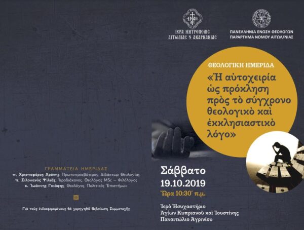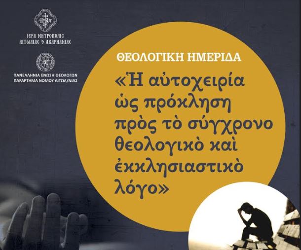 Η Ιερά Μητρόπολις Αιτωλίας και Ακαρνανίας και το Παράρτημα Αιτωλοακαρνανίας της Πανελληνίου Ενώσεως Θεολόγων, διοργανώνουν Θεολογική Ημερίδα, με θέμα: «Η αυτοχειρία ως πρόκληση προς το σύγχρονο θεολογικό και εκκλησιαστικό λόγο».