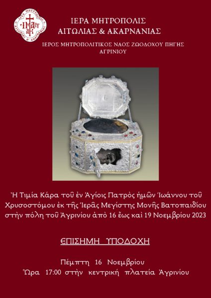 Σήμερα, Πέμπτη 16 Νοεμβρίου 2023 και ώρα 5 το απόγευμα στο Αγρίνιο, στην πλατεία Δημοκρατίας θα πραγματοποιηθεί η επίσημη υποδοχή της Τιμίας και Χαριτοβρύτου Κάρας του εν Αγίοις Πατρός ημών Ιωάννου του Χρυσοστόμου.