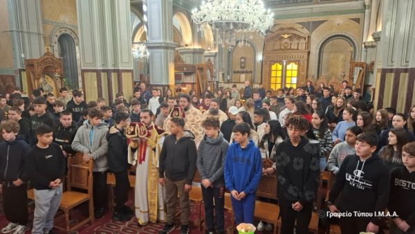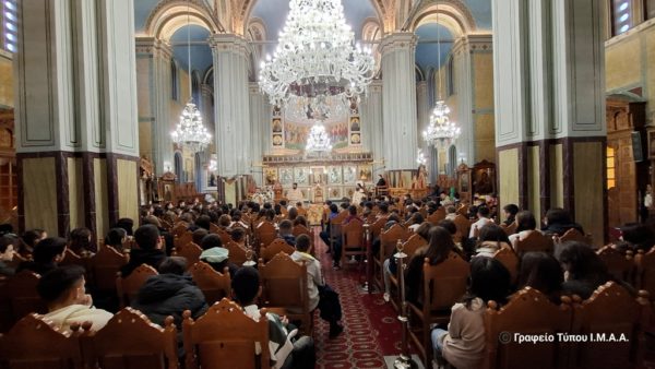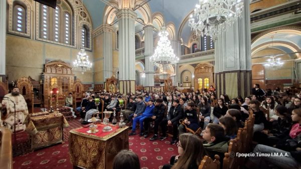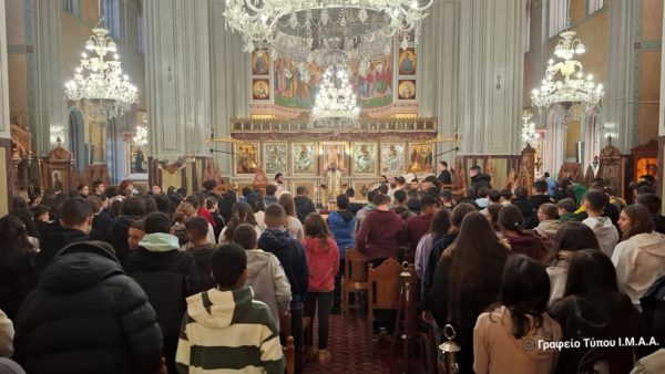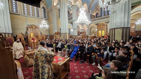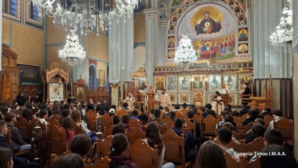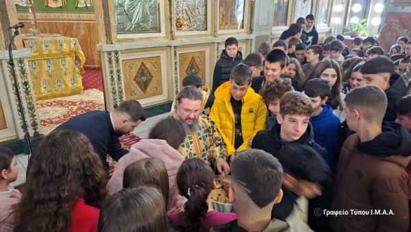 Κατά την Θεία Λειτουργία που τελέστηκε στον σολέα του Ναού, ο Σεβασμιώτατος επεξηγούσε με απλά λόγια τα τελούμενα, τα βασικά σημεία και τους συμβολισμούς του Μυστηρίου της Θείας Ευχαριστίας, με σκοπό οι μαθητές να μπορέσουν να συμμετάσχουν καλύτερα και να βιώσουν το ιερό Μυστήριο.