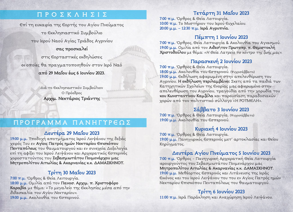 Εορταστικές εκδηλώσεις, με την ευκαιρία της Εορτής του Αγίου Πνεύματος θα πραγματοποιηθούν στον Ιερό Ναό Αγίας Τριάδος Αγρινίου, από την Δευτέρα 29 Μαΐου έως την Τρίτη 6 Ιουνίου 2023.