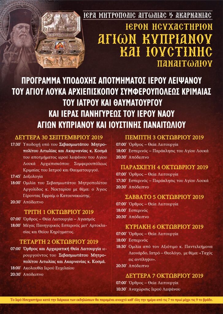 Η αγία μας Εκκλησία τιμά την Τετάρτη τη μνήμη των Αγίων Κυπριανού και Ιουστίνης. Με αφορμή την ετήσια πανήγυρη του ομώνυμου Ιερού Ησυχαστηρίου που βρίσκεται στο Παναιτώλιο προγραμματίζεται η υποδοχή του αποτμήματος ιερού λειψάνου του Αγίου Λουκά Αρχιεπισκόπου Συμφερουπόλεως Κριμαίας του Ιατρού και Θαυματουργού, καθώς και άλλες λατρευτικές και πνευματικές εκδηλώσεις.