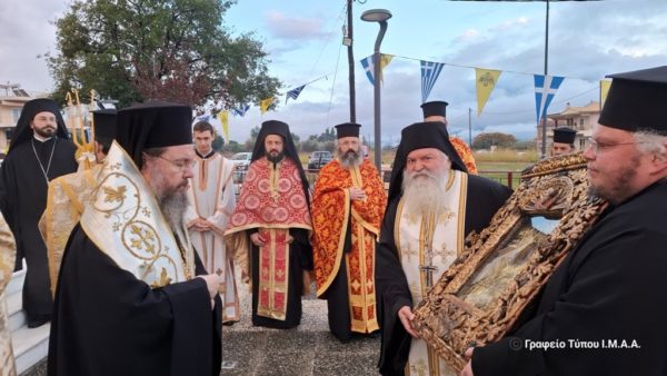 Επίσης, ευχαρίστησε τον Πανοσιολογιώτατο Αρχιμ. Θεόφιλο, Αδελφό της Ιεράς Μονής Παναγίας Χοζοβιώτισσας για την μεταφορά της Ιεράς Εικόνας και τον παρακάλεσε να μεταφέρει τις ευχαριστίες της τοπικής μας Εκκλησίας στον Καθηγούμενο και την Αδελφότητα της Ιεράς Μονής.