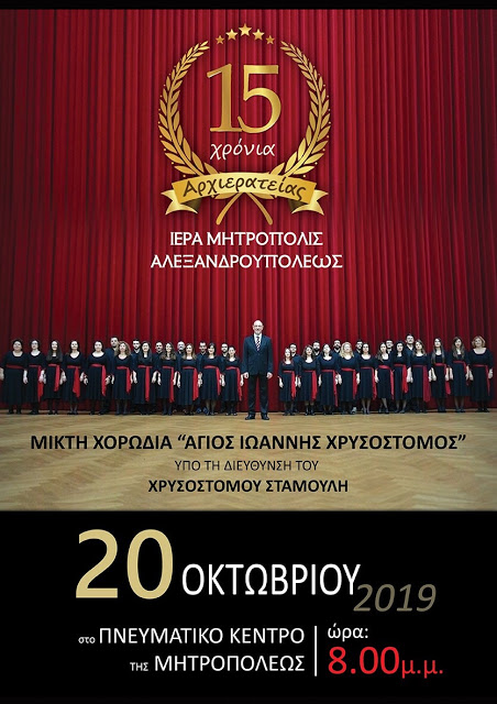 20.00΄: Μουσική Συναυλία στο Πνευματικό Κέντρο της Ιεράς Μητροπόλεως αφιερωμένη στα 15 χρόνια Αρχιερατείας του Σεβ. Μητροπολίτου κ. Ανθίμου με την διεθνούς φήμης Μεικτή Χορωδία «Άγιος Ιωάννης ο Χρυσόστομος» από την Θεσσαλονίκη, υπό την διεύθυνση του κ. Χρυσοστόμου Σταμούλη, καθηγητού Θεολογίας του Δ.Π.Θ.