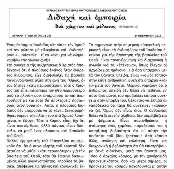 Ι.Μ. Αλεξανδρουπόλεως 24 Νοεμβρίου, 2019 ΔΙΔΑΧΗ ΚΑΙ ΕΜΠΕΙΡΙΑ του Σεβ. Μητροπολίτου κ.κ. ΑΝΘΙΜΟΥ Διαδώστε: ΔΙΔΑΧΗ ΚΑΙ ΕΜΠΕΙΡΙΑ – Κυριακό Κήρυγμα Σεβ. Μητροπολίτου κ.κ. ΑΝΘΙΜΟΥ κατά την ΚΥΡΙΑΚΗ 24 ΝΟΕΜΒΡΙΟΥ 2019. ΔΙΑΒΑΣΤΕ ΑΝΑΛΥΤΙΚΑ Διαδώστε: