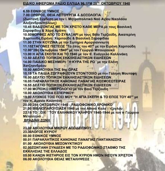 ΙΕΡΑ ΜΗΤΡΟΠΟΛΗ ΑΛΕΞΑΝΔΡΟΥΠΟΛΕΩΣ – Επετειακό Πρόγραμμα ΡΑΔΙΟ ΕΛΠΙΔΑ 96,1 για την 28η Οκτωβρίου 1940.