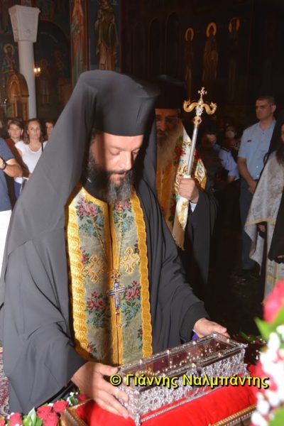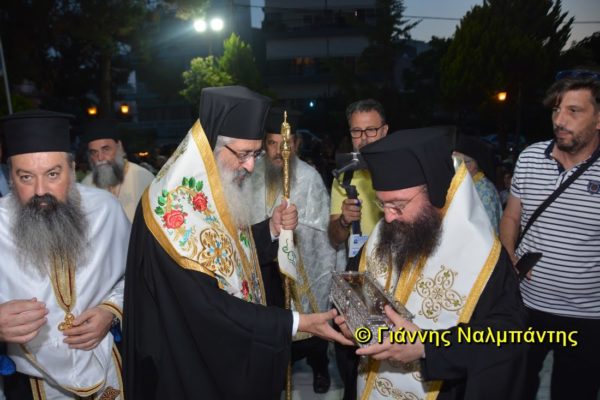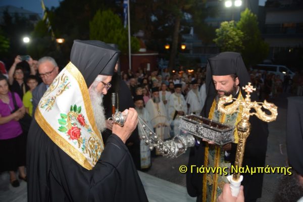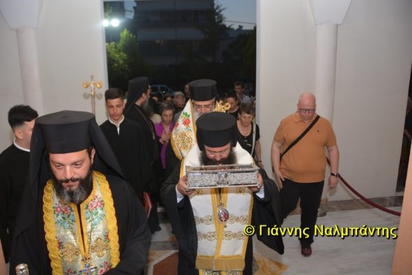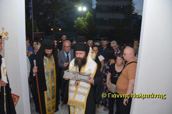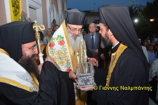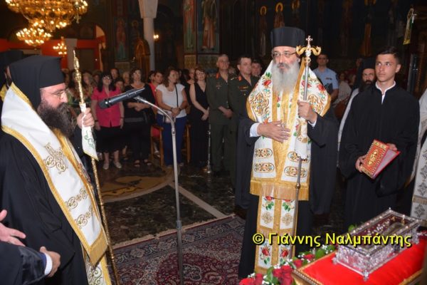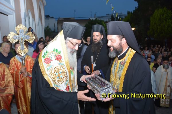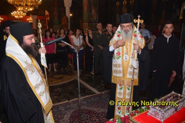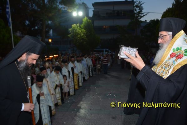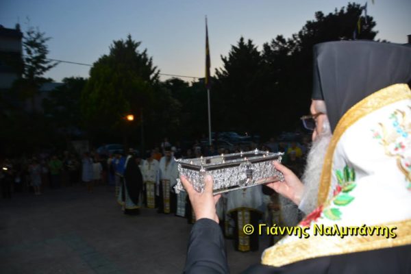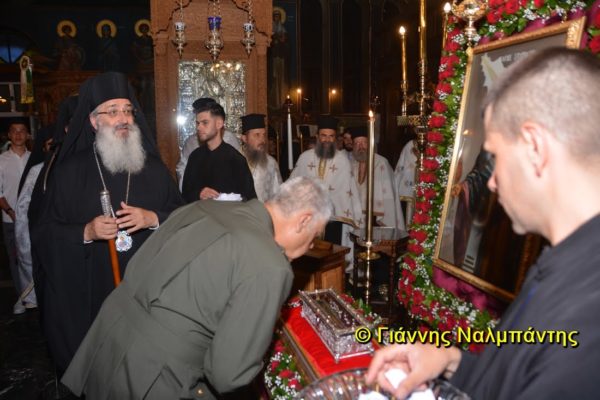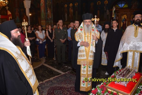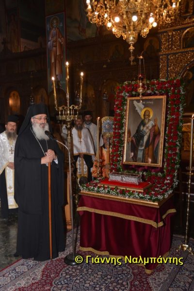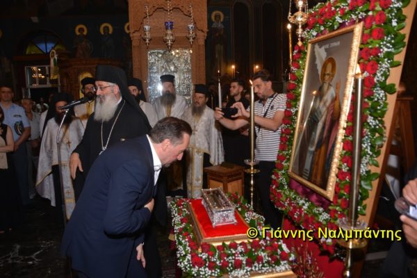 Το ιερό λείψανο υποδέχθηκαν ο Μητροπολίτης κ. Άνθιμος μαζί με τον Μητροπολίτη Χαλεπίου κ. Εφραίμ, του Πατριαρχείου Αντιοχείας, ο Δήμαρχος της πόλεως κ. Ζαμπούκης, ο Διοικητής της 12ης Μεραρχίας υποστράτηγος κ. Μπακιρτζής, ο Διοικητής της 23ης Ταξιαρχίας ταξίαρχος κ. Λαμπρόπουλος, εκπρόσωποι των τοπικών αρχών και πλήθος κόσμου.